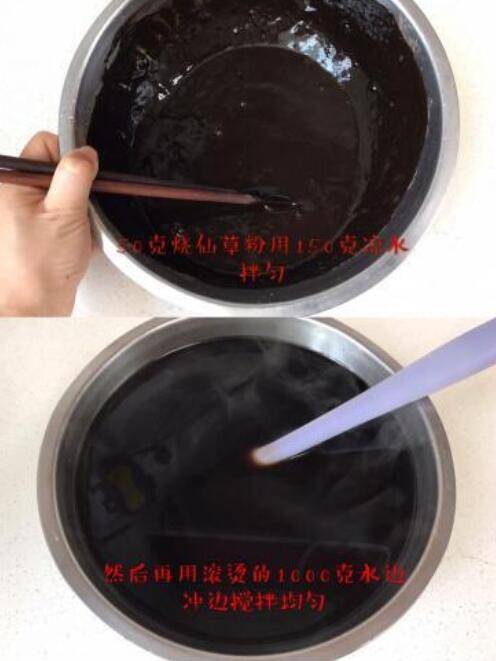 1、将50克烧仙草粉用150克凉水搅拌均匀。再用1000克滚烫开水冲泡。边冲边搅拌均匀。