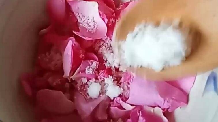 1、一层花瓣一层糖的放在罐子里。如此直至花瓣用完。