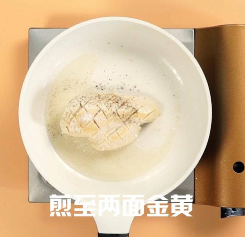 4、倒入食用油。放入鸡胸肉。煎至两面微黄。