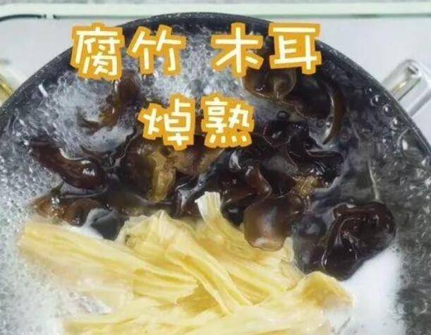 1、一根黄瓜拍几下。切成小段;干腐竹和干木耳泡好后。放入热水里焯熟。