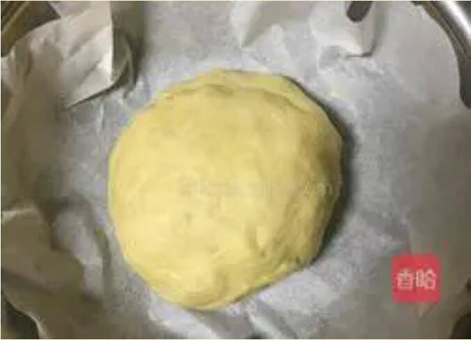 3、在盆里垫一块硅油纸放入面团。盖上保鲜膜放入冰箱松弛一晚。