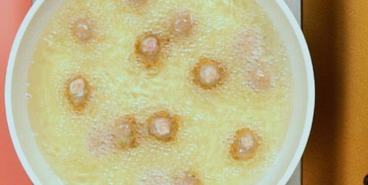 3、锅中倒油加热。用小勺将肉馅团成丸子放入锅内。小火炸至丸子熟透即可。