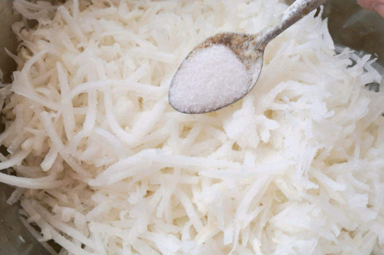 将萝卜丝放入盆中。撒入适量的盐腌制。 盐可以杀菌。还能有效的去除萝卜中的水分。等待大概20分钟后。萝卜丝腌制出水。先用盐腌制的萝卜丝。在经过发酵后。香气浓郁。口感鲜脆。适当食用。可促进人体肠道的消化吸收。