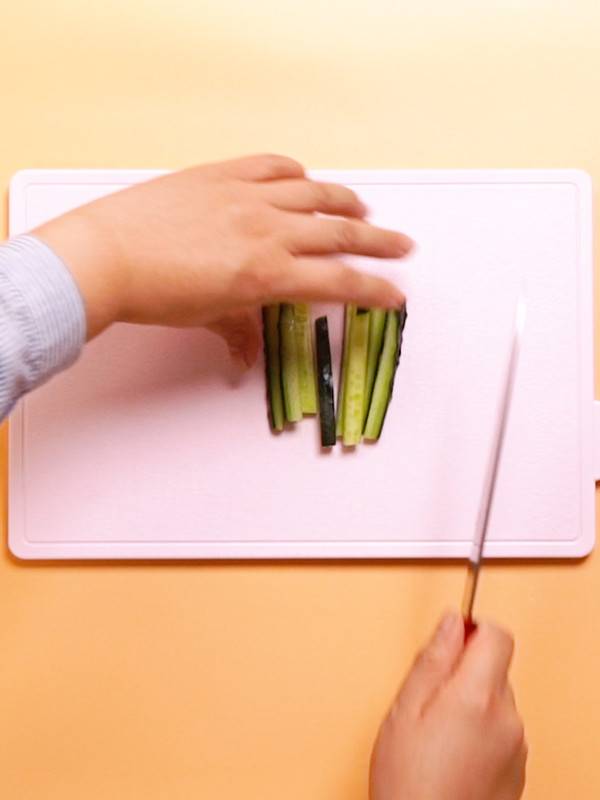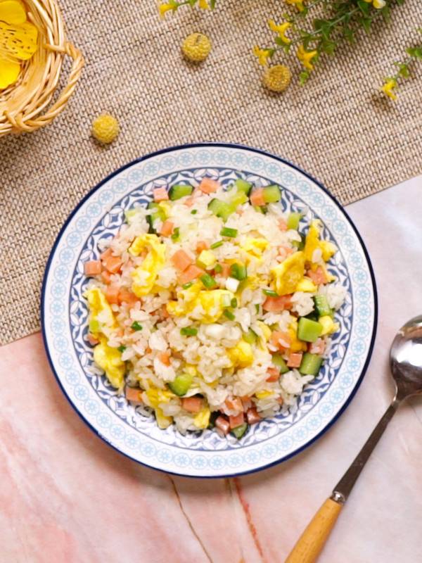 1、8克葱末。80克午餐肉切丁、50克黄瓜切丁。1个鸡蛋打散成蛋液。