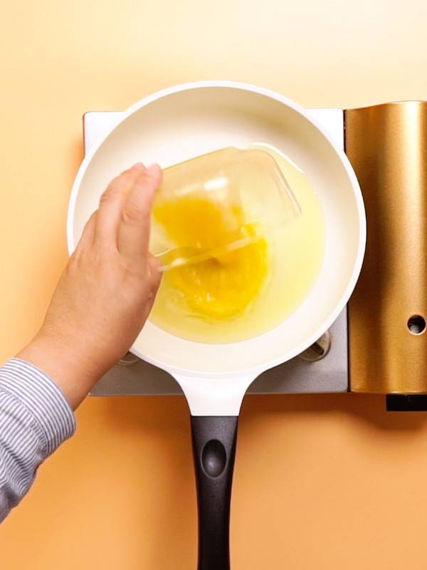 2、锅中倒入5毫升食用油。倒入蛋液。小火炒熟。