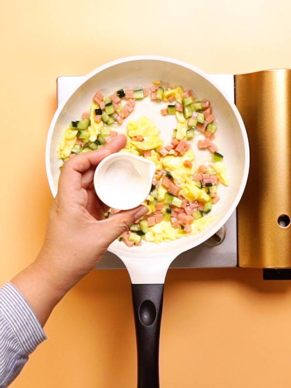 3、倒入午餐肉、黄瓜丁。翻炒均匀。加入2克盐2克。翻炒均匀。