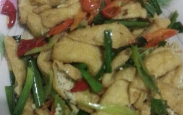 材料:豆腐泡、辣椒、蒜苗、食用油、盐。
