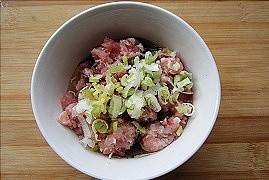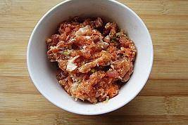 2、葱姜切末、胡萝卜擦丝后剁碎一起放入肉馅里搅拌均匀。即成蛋饺的内馅。