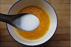 3、干淀粉加入2小勺清水搅拌成水淀粉。两个鸡蛋加盐后搅打。加入水淀粉搅匀。即成制作蛋饺皮的蛋液。