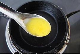 4、小锅中擦少许油。烧热后放入1汤匙蛋液。