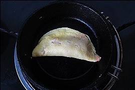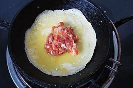 6、旋转锅子使蛋液铺匀。放入适量的内馅。