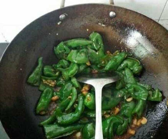 3、放点油爆炒辣椒1分钟。再放生抽。蚝油。鸡精爆炒直到入味。