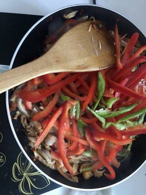 3、倒入肚条翻炒几下。加入红椒青椒。翻炒至断生。加入适量的盐。生抽大火翻炒。