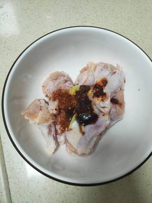 3、切小的小鸡腿放碗里。加入适量的盐、料酒、蚝油、生抽、姜片、老干妈。