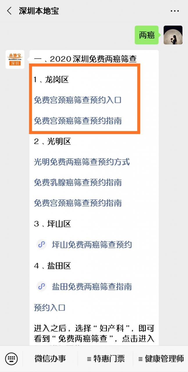 温馨提醒:打开微信搜索【深圳内陆宝】民众号。关注后:回复【两癌】。即可获取深圳龙岗区免费两癌筛查预约方式!具体操作如下图所示。深圳内陆宝将连续关注免费两癌筛查信息!