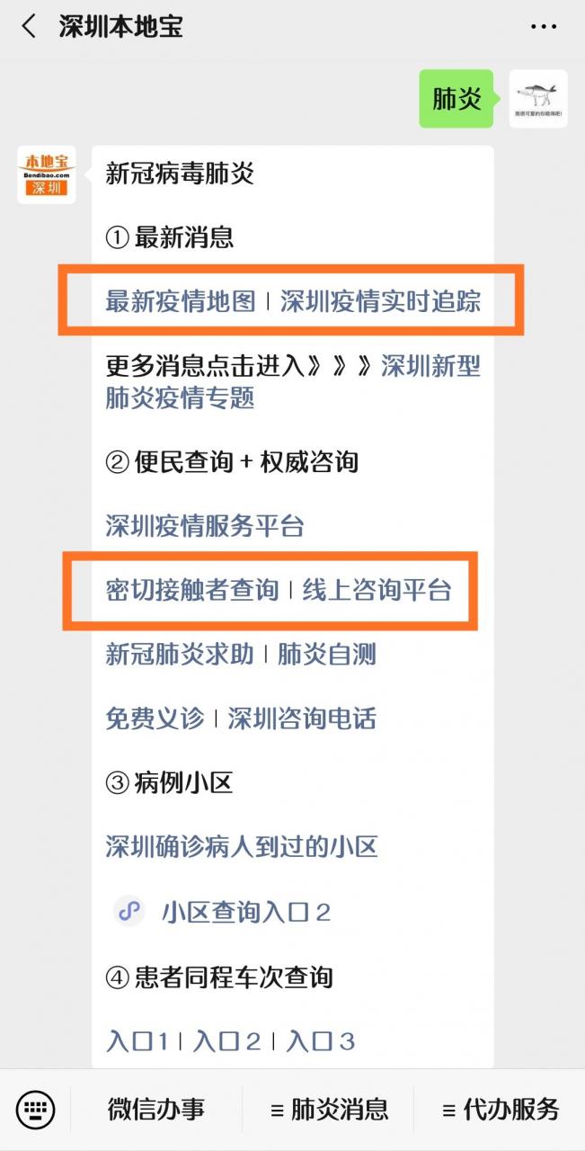 温馨提醒:微信搜索民众号【深圳内陆宝】。关注后在对话框回复【肺炎】:即可获取新冠肺炎密切接触者查询入口!和查询天下新冠肺炎实时动态新闻!同时还可以查询天下确诊病人到过哪些小区、获取新冠肺炎自查和求助、免费义诊、线上咨询平台。查询同程患者车次、深圳发烧门诊地址导航、新型肺炎辟谣入口、新型冠状病毒科普知识、疾病症状、预防措施等新闻!