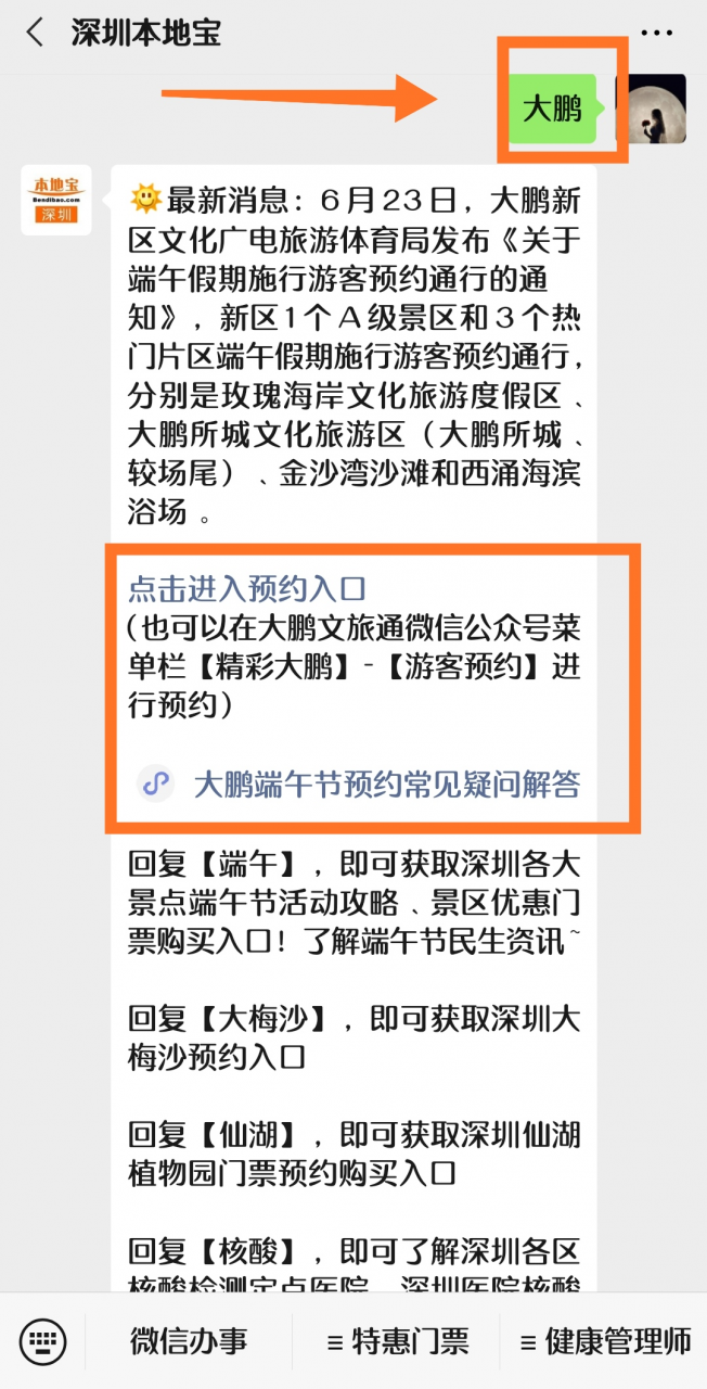 温馨提示:打开微信搜索【深圳本地宝】公众号。关注后在对话框回复【大鹏】。即可在手机进入深圳玫瑰海岸游玩预约入口!马上进行预约~回复【大梅沙】。即可获取深圳大梅沙海滨公园预约入口~回复【端午节】。即可了解深圳端午节各景点活动及优惠门票购买入口!